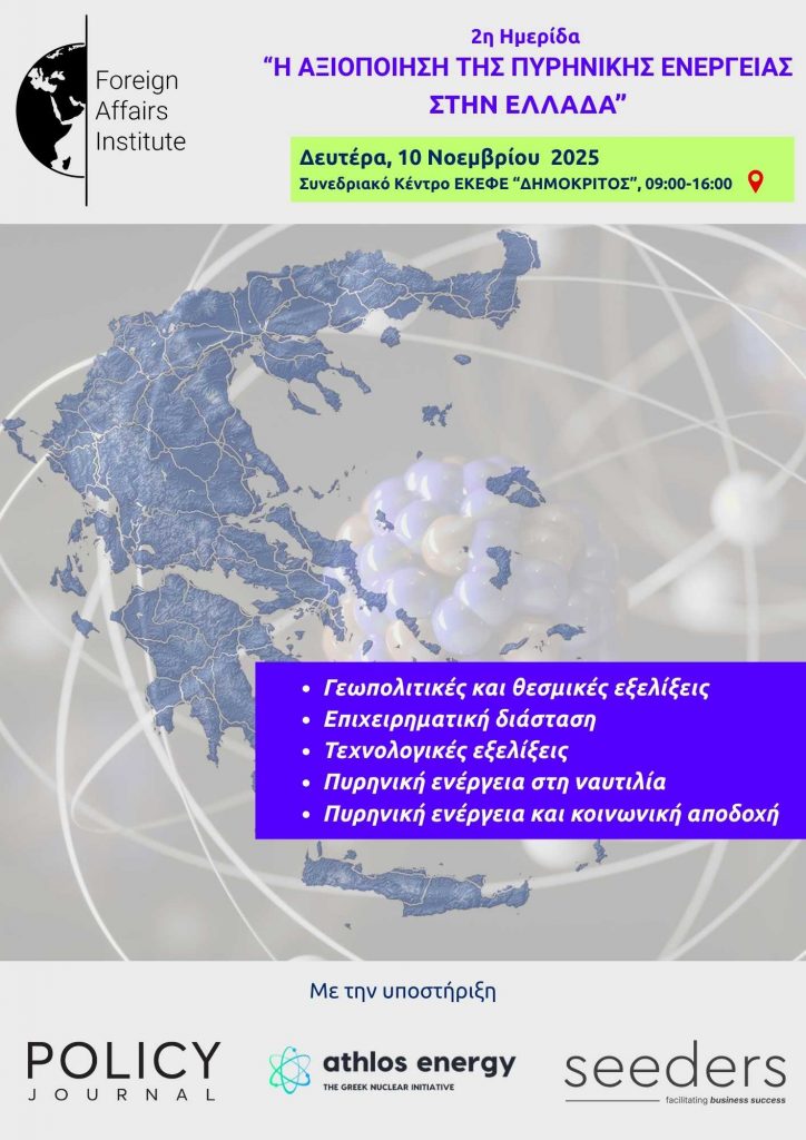 Ημερίδα με θέμα την «Αξιοποίηση της Πυρηνικής Ενέργειας στην Ελλάδα» διοργανώνει για δεύτερη φορά το Ινστιτούτο Εξωτερικών Υποθέσεων, την Δευτέρα, 10 Νοεμβρίου 2025, στο Συνεδριακό Κέντρο ΕΚΕΦΕ «Δημόκριτος», Νεαπόλεως 27 & Πατριάρχου Γρηγορίου Ε’, Αγία Παρασκευή, στις 10.00 π.μ. Όσοι επιθυμούν να παρακολουθήσουν δια ζώσης μπορούν να εγγραφούν στον κατωτέρω σύνδεσμο: https://www.eventora.com/el/Events/2h-hmerida-h-a3iopoihsh-ths-py Στην ημερίδα […]