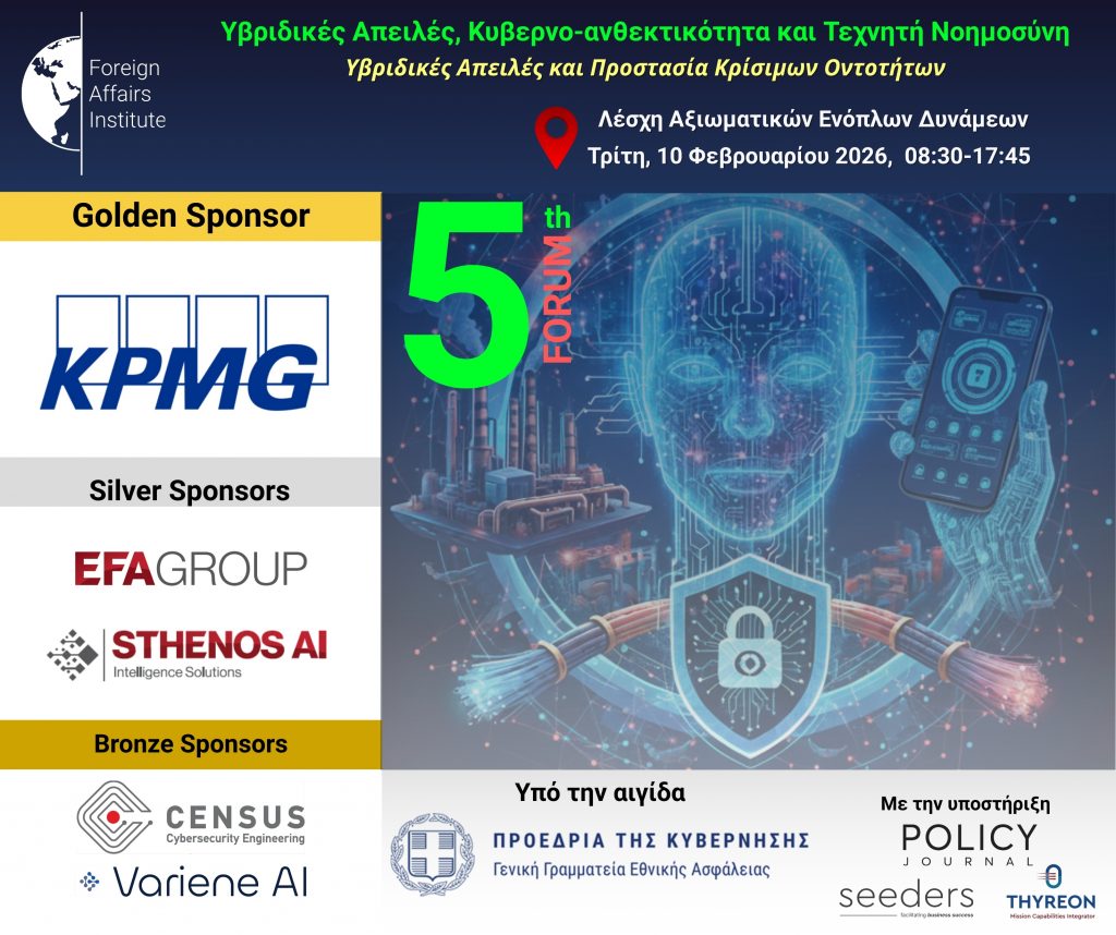 Το Ινστιτούτο Εξωτερικών Υποθέσεων (Foreign Affairs Institute, FAINST) διοργανώνει για 5η φορά το «Forum για τις Υβριδικές Απειλές, την Κυβερνο-ανθεκτικότητα και την Τεχνητή Νοημοσύνη». Φέτος η εκδήλωση θα εστιάσει στις «Υβριδικές Απειλές και Προστασία Κρίσιμων Υποδομών». Η εκδήλωση θα πραγματοποιηθεί την Τρίτη, 10 Φεβρουαρίου 2026 στην Λέσχη Αξιωματικών Ενόπλων Δυνάμεων (Ρηγίλλης 1), στην Αθήνα. Καθώς οι θέσεις της αίθουσας είναι περιορισμένες, […]