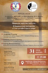 Επίκαιρη συζήτηση για την «Θρησκεία, ισχύς και διάλογος: Η θρησκευτική διπλωματία σ’ έναν μεταβαλλόμενο κόσμο» διοργανώνεται την Τρίτη 31 Μαρτίου στις 7 το απόγευμα, στο αμφιθέατρο «Μίκης Θεοδωράκης» του δήμου Παπάγου – Χολαργού (Περικλέους 55, Χολαργός) από το Ινστιτούτο Εξωτερικών Υποθέσεων (www.fainst.eu) και τα τμήματα «Περικλής», «Πρωτέας», και «Μιλτιάδης» της AHEPA HELLAS.